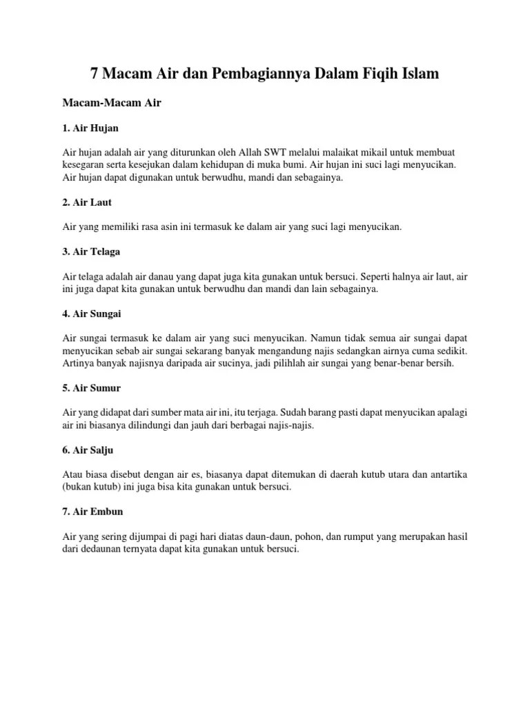 Macam Air Dan Pembagianya - Doc Aik Taharah Bersuci Dian Purnamasari Thalib Academia Edu : Yaitu air yang yang masih murni yang jatuh dari langit atau terbit dari bumi dan masih tetap belum berubah keadaannya, .. Air yang dapat digunakan untuk bersuci ada tujuh macam, yakni air hujan, air laut, air sungai, air sumur, air mata air, dan air salju, dan air . Air es atau air salju · 7. 6 jenis air dan pembagiannya; ١٦ جمادى الآخرة ١٤٤٣ هـ. Yaitu air yang yang masih murni yang jatuh dari langit atau terbit dari bumi dan masih tetap belum berubah keadaannya, .